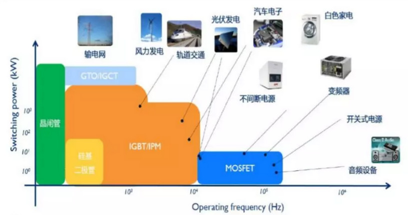 目前碳化硅功率器件主要定位于功率在1kw-500kw之间、工作频率在10KHz-100MHz之间的场景,特别是一些对于能量效率和空间尺寸要求较高的应用,如电动汽车车载充电机与电驱系统、充电桩、光伏微型逆变器、高铁、智能电网、工业级电源等领域,可取代部分硅基MOSFET与IGBT。