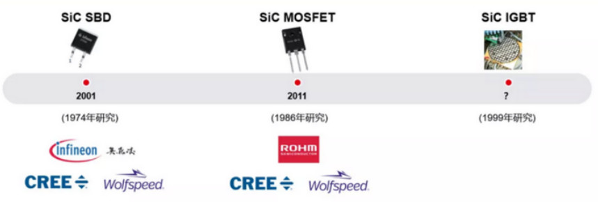 碳化硅功率半导体器件从上个世纪70年代开始研发,经过30年的积累,于2001年开始商用碳化硅SBD器件,之后于2010年开始商用碳化硅MOSFET器件,当前碳化硅IGBT器件还在研发当中。