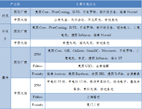 目前整个产业链上主要有如下代表性企业,并且由于碳化硅分立功率器件的性能与材料、结构设计、制造工艺之间的关联性较强,同时为了加强成本的控制与工艺品控的改进,不少企业仍选择采用IDM模式,如Cree和Rohm甚至覆盖了碳化硅衬底、外延片、器件设计与制造全产业链环节,其中Cree占据衬底市场约40%份额、器件市场约25%份额,并且Infineon、Cree、Rohm、ST四家合计占有全球器件市场近90%的份额,均为IDM模式。