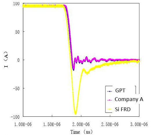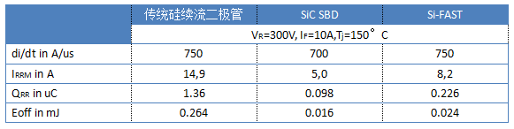 图2.传统硅续流二极管、SiC肖特基二极管和快速硅二极管的动态参数