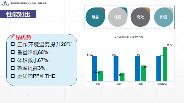 由于材料性能的限制,传统硅基功率器件在许多方面已逼近甚至达到了其材料的本征极限。相比于传统的硅快恢复二极管,碳化硅二极管的性能有着极大的优势,如:能承受更大的电压、更高的开关速度、更小的能量损失、更耐高温。因此应用碳化硅器件的设计方案可以允许更小的电感、电容、热沉体积,不仅使得功率模组体积重量大大减小,还可整体改善功率模组的成本。图1是针对20kW充电模块产品,进行全SiC方案和传统Si方案的对比,可以直观的看出:应用SiC功率器件后,整体产品的体积、重量、损耗和工况温度均得到了显著改善。