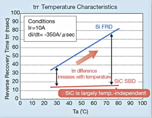 图4.SiC肖特基二极管与快速硅二极管的trr温度特性