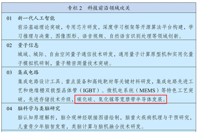 2021年3月13日,新华网刊登了《中华人民共和国国民经济和社会发展第十四个五年规划和2035年远景目标纲要》,其中“集成电路”领域,特别提出碳化硅、氮化镓等宽禁带半导体要取得发展。