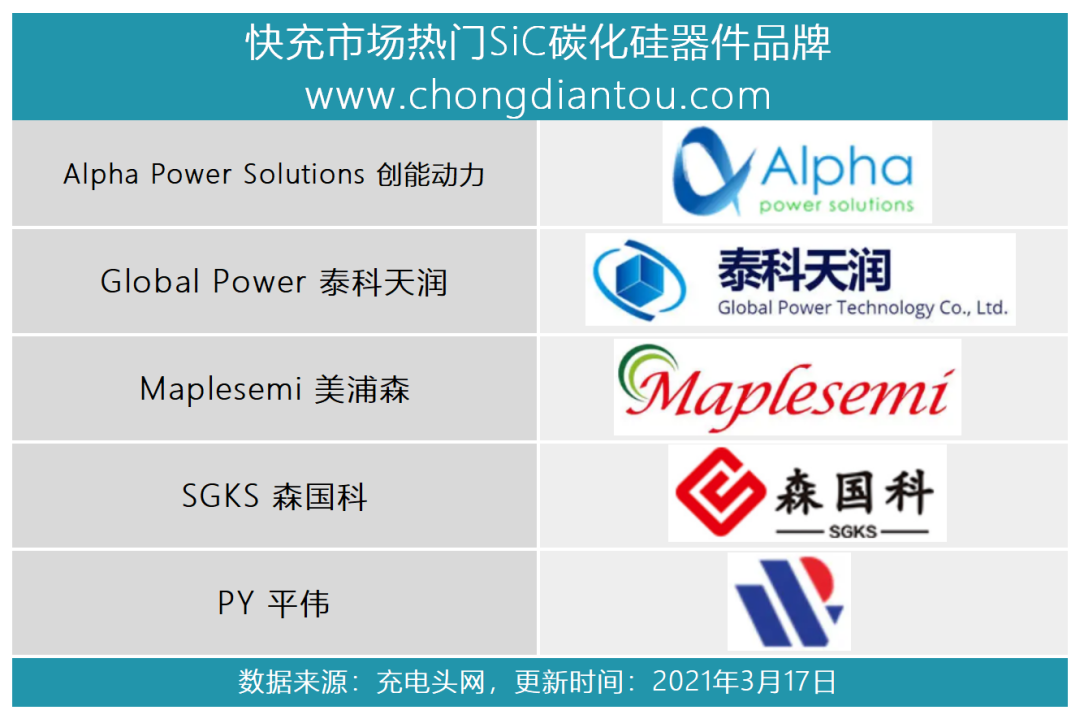 充电头网通过调研了解到,目前市面上可用于大功率USB PD快充电源领域的碳化硅有五家供应商,分别是Alpha Power Solutions创能动力、Global PowerPA旗舰厅、Maplesemi美浦森、SGKS森国科以及PY平伟。